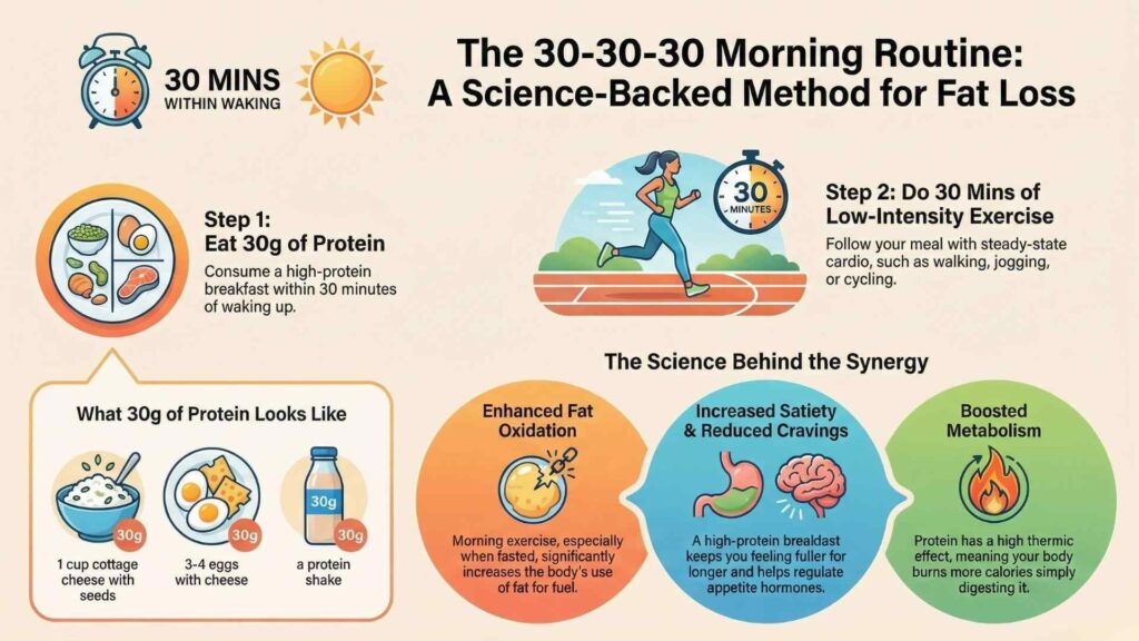 The 30/30/30 rule for weight loss is a morning routine where you consume 30 grams of protein within 30 minutes of waking up, followed by 30 minutes of low-intensity steady-state (LISS) exercise. This method helps stabilize blood sugar, manage hunger hormones, and promote sustainable fat loss without restrictive dieting.