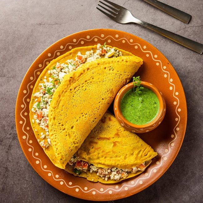 A healthy, protein-rich Indian breakfast or snack — besan (gram flour) pancakes stuffed with spicy crumbled paneer. Easy to cook, vegetarian, and great for a balanced diet.