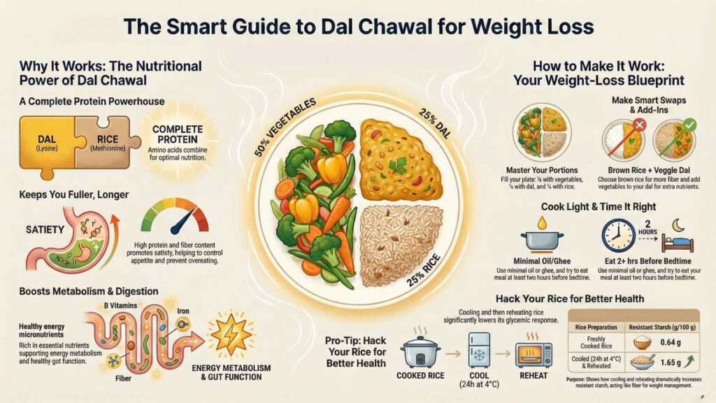To eat dal chawal for weight loss, follow the 2:1 rule (two parts dal to one part rice), use cooled rice to increase resistant starch, and always add a side of fiber-rich vegetables or salad.