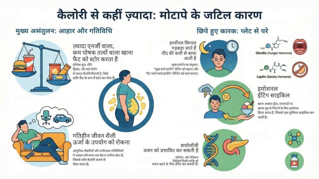 मोटापा मुख्य रूप से शरीर में ‘कैलोरी सरप्लस’ यानी ज़रूरत से ज़्यादा ऊर्जा जमा होने के कारण बढ़ता है। जब हम अपनी शारीरिक सक्रियता से अधिक कैलोरी लेते हैं, तो हमारा शरीर उसे वसा (Fat) के रूप में जमा करने लगता है। इसके पीछे भारत में वजन बढ़ने के मुख्य कारण और उपचार की बात करें, तो खराब मेटाबॉलिज्म, प्रोसेस्ड फूड, तनाव और हार्मोनल असंतुलन (PCOS/थायराइड) सबसे बड़े कारक हैं ।